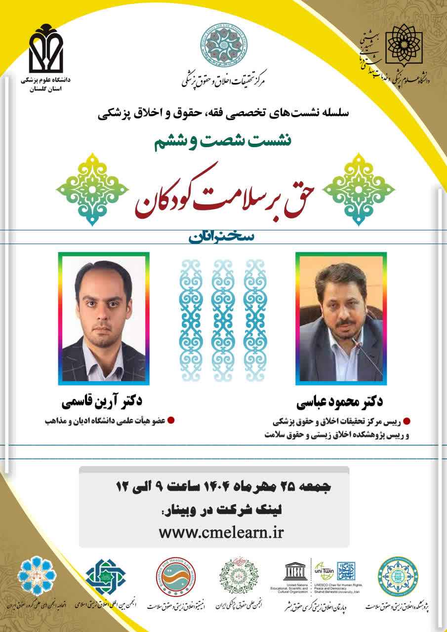 سلسله نشستهای تخصصی فقه، حقوق و اخلاق پزشکی ؛ نشست شصت و ششم با عنوان «حق بر سلامت کودکان» با تدریس جناب آقای دکتر محمود عباسی و جناب آقای دکتر آرین قاسمی به صورت وبینار در روز جمعه به تاریخ ۲۵ مرداد ماه ۱۴۰۴ از ساعت ۰۹:۰۰ الی ۱۲:۰۰ برگزار میگردد.