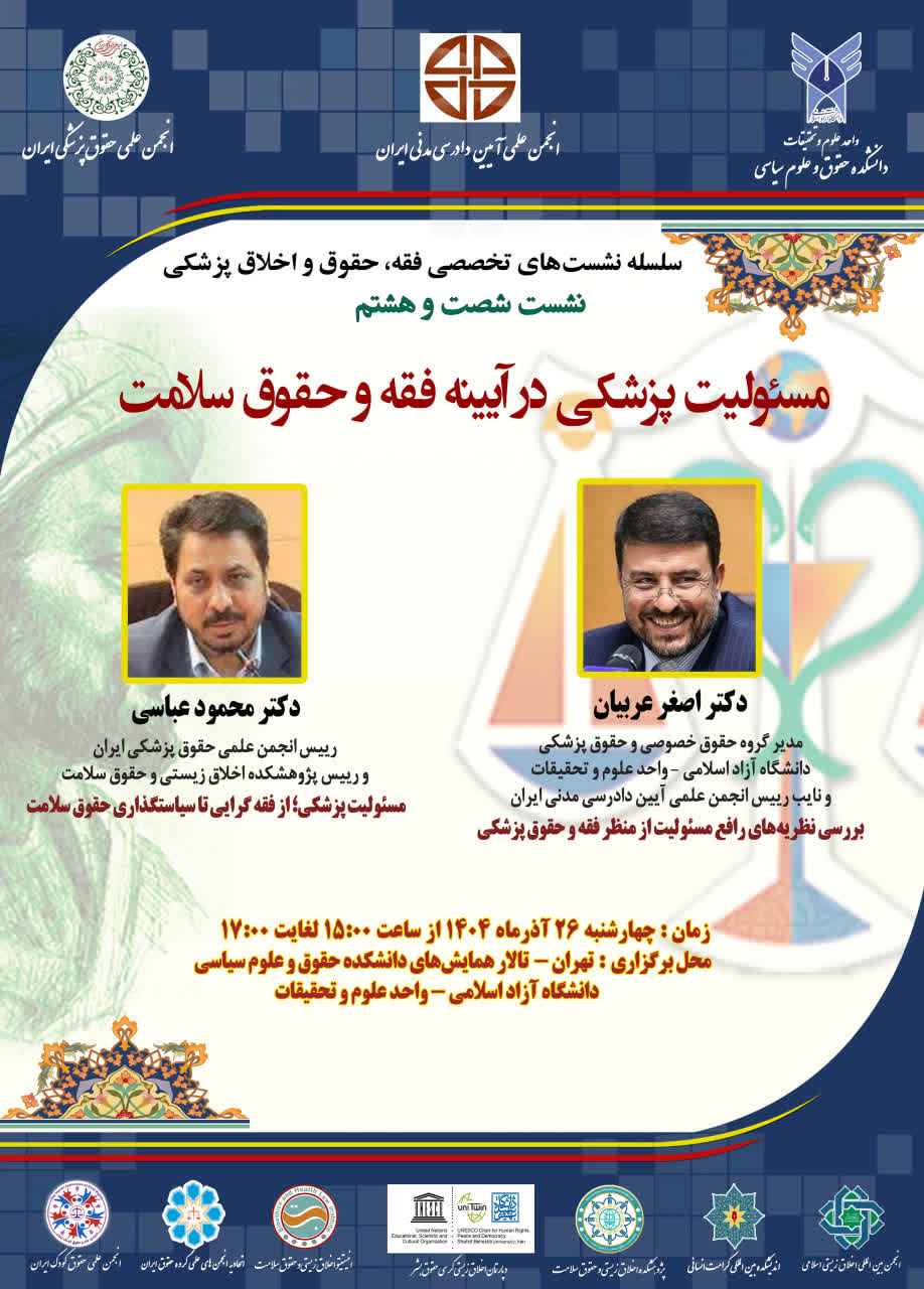 سلسله نشستهای تخصصی فقه، حقوق و اخلاق پزشکی ؛ نشست شصت و هشتم با عنوان «مسئولیت پزشکی در آیینه فقه و حقوق سلامت» با تدریس جناب آقای دکتر محمود عباسی و جناب آقای دکتر اصغر عربیان.