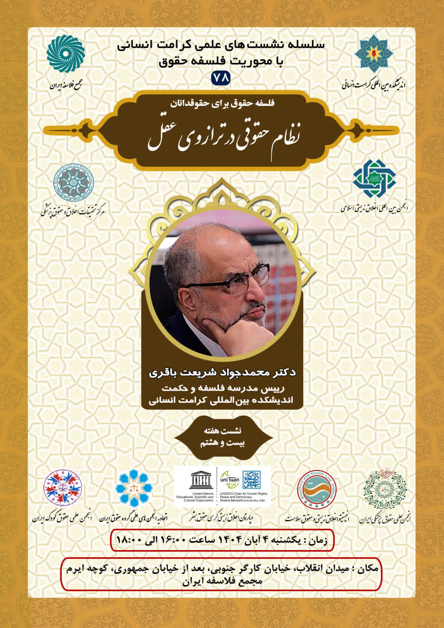 اطلاعیه برگزاری سلسله نشستهای علمی کرامت انسانی با محوریت فلسفه حقوق ؛ نشست هفته بیست و هشتم؛ نظام حقوقی در ترازوی عقل (۷۸) |