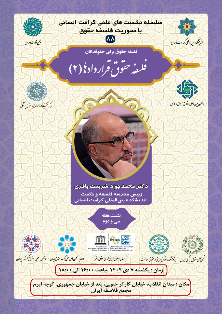 اطلاعیه برگزاری سلسله نشستهای علمی کرامت انسانی با محوریت فلسفه حقوق ؛ نشست هفته سی و دوم؛ فلسفه حقوق قراردادها ۲ (۸۸)