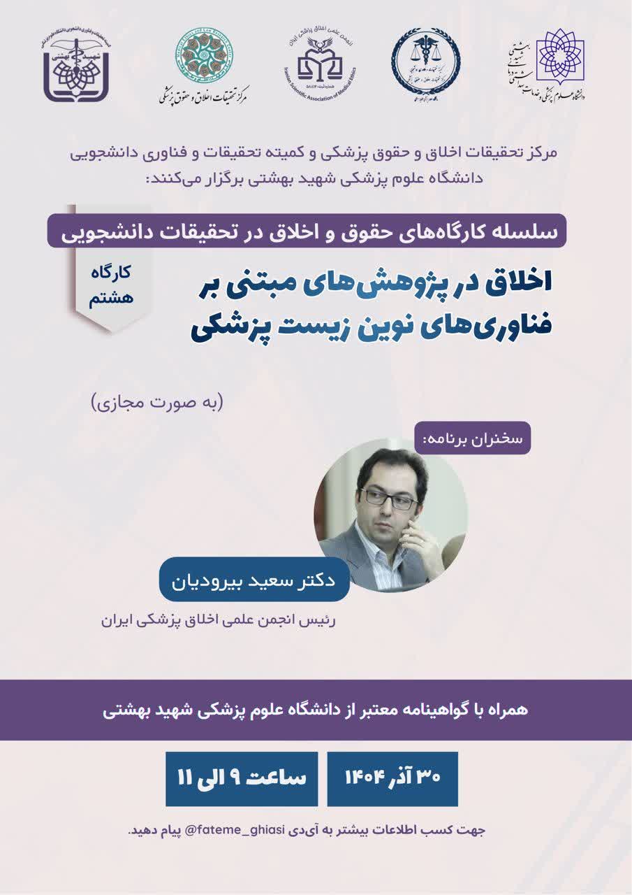 مرکز تحقیقات اخلاق و حقوق پزشکی و کمیته تحقیقات و فناوری دانشجویی دانشگاه علوم پزشکی شهید بهشتی برگزار می کنند: