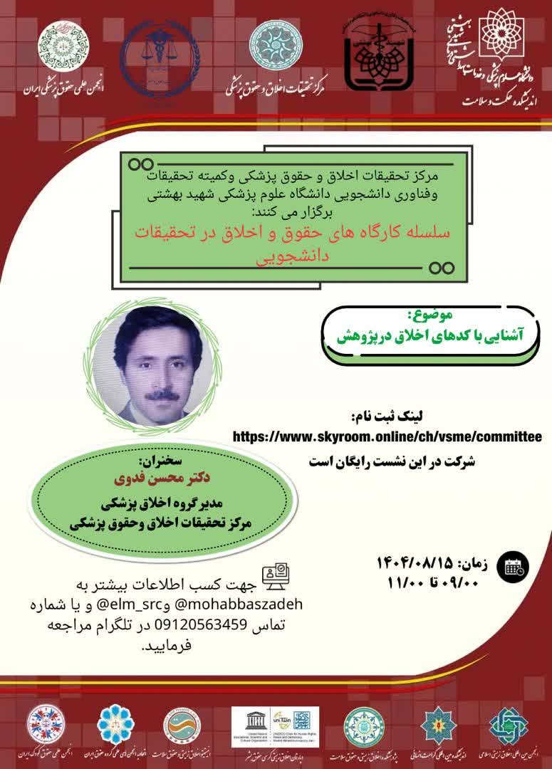 مرکز تحقیقات اخلاق و حقوق پزشکی و کمیته تحقیقات و فناوری دانشجویی دانشگاه علوم پزشکی شهید بهشتی برگزار می کنند: سلسله کارگاه های حقوق و اخلاق در تحقیقات دانشجویی جلسه اول موضوع: آشنایی با کدهای اخلاق در پژوهش تاریخ برگزاری: ۱۵ آبان ۱۴۰۴ ساعت: ۹ الی ۱۱ سخنران: جناب آقای دکتر محسن فدوی (مدیر گروه اخلاق پزشکی مرکز تحقیقات اخلاق و حقوق پزشکی) لینک ثبت نام: https://forms.gle/D۵UYojRyDkS۹KZVN۸ لینک ورود به جلسه: https://www.skyroom.online/ch/vsme/committee *جهت کسب اطلاعات بیشتر به شماره ۰۹۱۲۰۵۶۳۴۵۹ پیامک ارسال فرمایید.