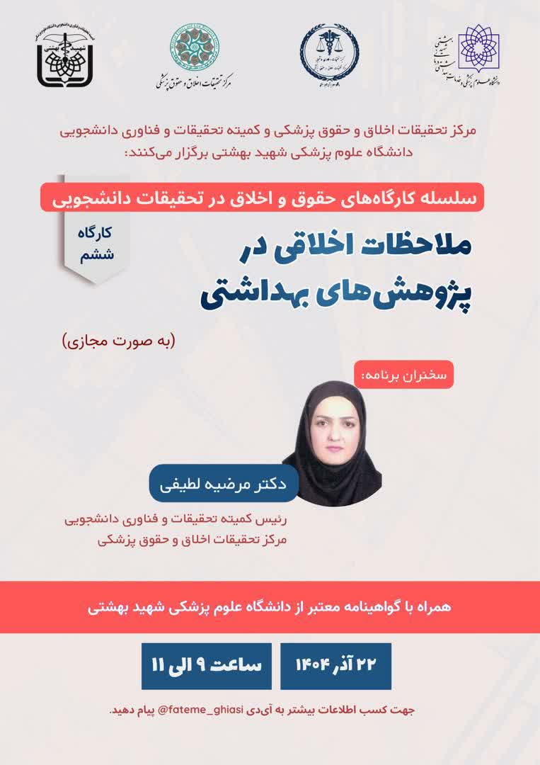 :: اطلاعیه برگزاری سلسله کارگاه های حقوق و اخلاق در تحقیقات دانشجویی؛ ملاحظات اخلاقی در پژوهش‌های بهداشتی ::